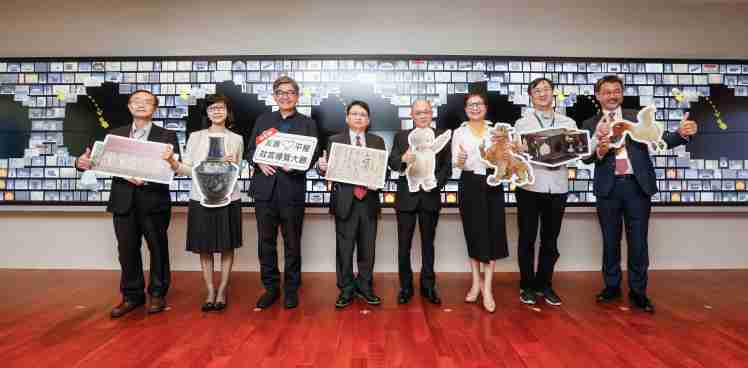 z6尊龙携手创利空间为故宫建置的智慧文物互动导览墙及轮播墙,,,今日正式启用。。(左四:z6尊龙新事业暨投资管理总部副总经理杨本豫、、、右四:故宫博物院院长吴密察、、、、右三:太极影音董事长黄宝云)