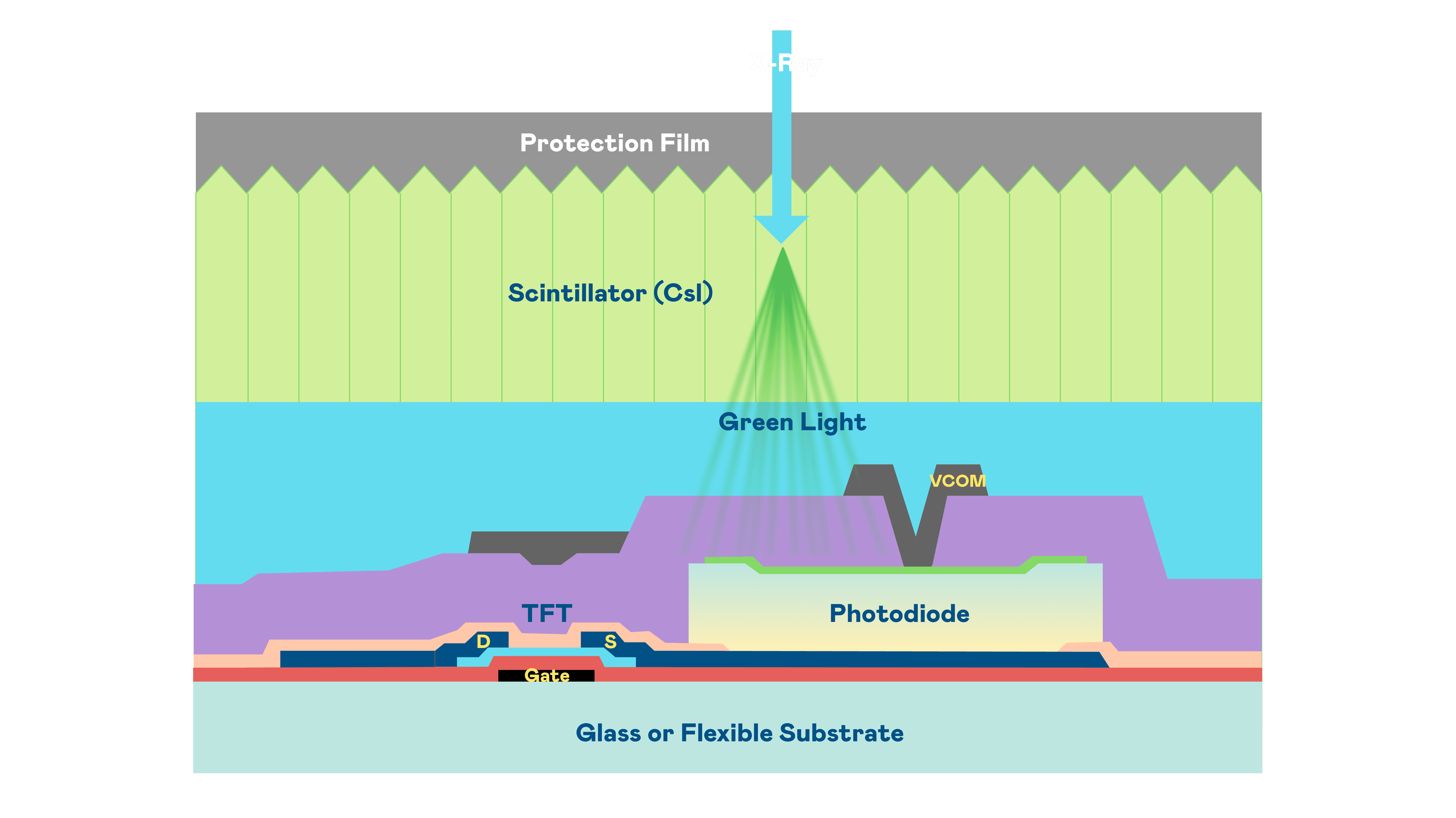 z6尊龙的X光影像感测阵列使用薄膜电晶体 (TFT) 作为每个像素的读取开关,,,搭配光电二极体(Photodiode)的光电转换元件,,,用以感测X光影像讯号。。